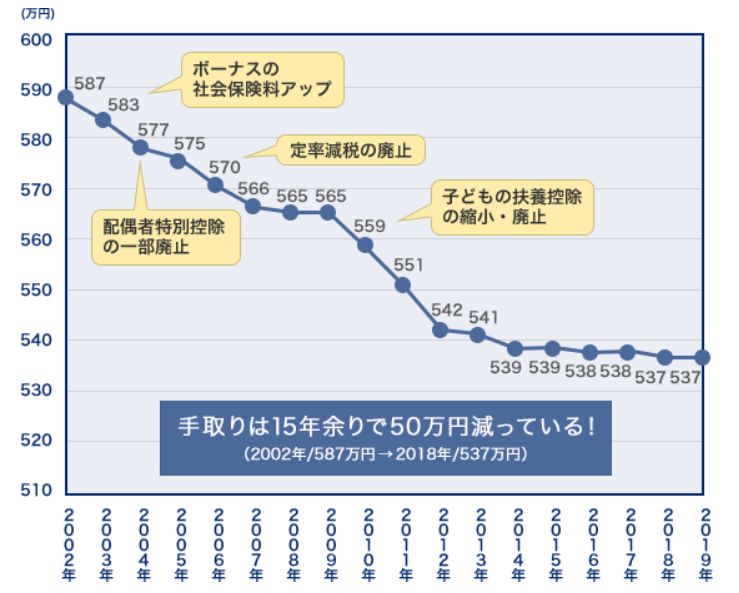 年収700万円の手取り金額はだいたい530万円程度は、手取り年収も15年間で50万円も減ってきているのです。