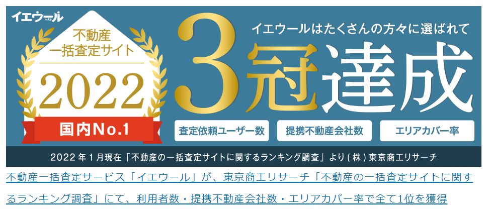 数ある不動産査定サイトの中で「不動産一括査定サイトランキング調査」において、「利用者数」「提携会社数」「エリアカバー率」など3部門で1位を獲得。