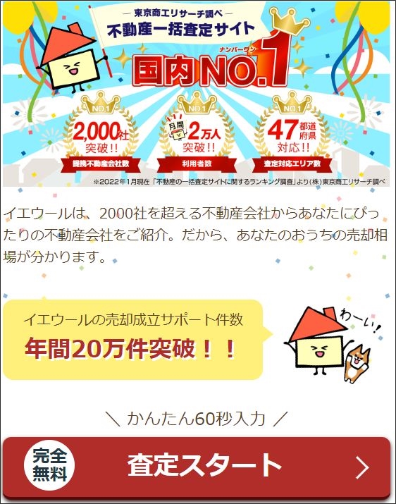 イエウールは、CMでも有名な大手不動産から地元に密着した不動産会社まで何と2000社と提携している人気の不動産一括査定サービスです。