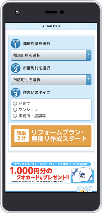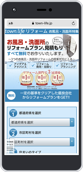 お風呂のリフォーム業者を探す場合は、近くのショールームなどに足を運ぶのが一般的ですよね。 そこで営業担当の人に説明を受けて、見積もりを出してもらうのがオーソドックスな方法です。 でも実は、同じリフォームでもリフォーム会社によって金額が全然違うんです! 上の例でみると、一番高いところと安いところでは50万円も差があります。 これはリフォーム会社によって使用する材料費が違ったり、人件費や輸送費の差で起こるもの。 だからなるべく費用を抑えたいなら、数多くのリフォーム業者から見積りをもらい、どこが安いのか比較することが重要なのです。 だから1社でしか見積もりをもらわないと、高額なリフォームプランを提案されても気づくことができません。 同じリフォーム内容なのに他社の方が金額が全然安かった、なんてことになったらショックすぎます。 でもいろんなショールームに行って見積もりを出してもらうのは大変。 そこでおすすめなのがリフォームの一括見積サイトです。 ✓一度の入力で複数社から見積もりがもらえる → リフォーム費用を比較できるので優良店を探せる ✓価格競争が入るので、ボッタクリ価格の見積もりを出せない → 適正価格になりやすい ✓加盟店の質が悪いと噂が広まって集客出来ないので、見積もりサイトが加盟店選びで慎重になる → 優良企業が集まりやすい 一括見積をすることで、あなたに合ったリフォームを適正価格でしてくれる業者を簡単に見つけることができるようになるんです! なのでリフォームするときは複数社から見積もりを取り、比較検討してから依頼先を決めるのが◎ですよ。 複数社の見積もりを取るなら、一括査定サイトを使うのが便利。 一括査定サイトを利用すれば、一度条件を入力するだけで簡単に複数社から見積もりを取ることができます。 これらのサイトは信頼性も高いので、近年利用者が増えているんですよ! こんな感じでスマホやパソコンからポチポチっと入力するだけで、あなたに合ったリフォーム会社を複数紹介してくれます。 見積りが出たあとは価格や内訳、プラン、担当者の対応などを比べ、その中から希望の依頼先を決めればOK。 自分で比較して一番納得できる業者を選べるので、満足できるリフォームにもつながりますよ! こういった一括見積サイトは、厳しい審査基準をクリアした地元の優良会社のみを紹介してくれるから安心です。 リフォームを検討している方は、ぜひ一括比較サイトを利用してみてくださいね。 当サイトのおすすめの一括見積サイトは「タウンライフリフォーム」です! タウンライフリフォームには数多くのリフォーム業者が登録しているので、複数社の見積もり比較がとても簡単にできちゃいます。 タウンライフリフォームはアンケート調査でリフォーム部門3冠を達成している、実績のあるサイトなんですよ。 だから口コミでも「納得のいくリフォームができた」という方がたくさん。 タウンライフリフォームに登録している業者は、全て厳しい審査基準をクリアしています。 優良な業者ばかりだから、いい口コミがたくさん集まるんですね♪ でもやっぱり人とのかかわりだから、いざ業者と話してみたら「希望と合わなかった」とか「相性が良くないかも?」みたいな可能性はあります。 そんな時は違う業者を紹介してもらうこともできるので、安心してくださいね。 あなたが納得するまで相談できるところも、タウンライフリフォームのメリットなんですよ。 今、タウンライフリフォームではキャンペーンを実施中。 紹介されたリフォーム会社に見積りの作成を依頼すると成功するリフォーム7つの法則小冊子(PDF)のプレゼントがありますよ! さらにリフォーム工事を行うと、1,000円分のクオカードのプレゼントも。 見積もりは無料なので、お風呂リフォームを考えているならタウンライフリフォームを使うと簡単おトクなのは間違いなしですよ♪ キャンペーン中でラッキーなうちに、ぜひ利用してみてくださいね! \タウンライフリフォームなら無料見積もり/ 簡単入力は1分程度で終わります