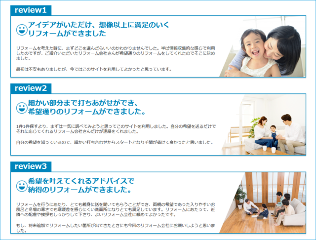 いくつかの事例を確認することでどんなリフォームをするかの検討が付きますので、リフォームをサクサク進めて行けますよ。