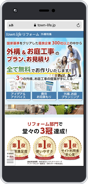 タウンライフリフォームはアンケート調査でリフォーム部門3冠を達成している、実績のあるサイトなんですよ。